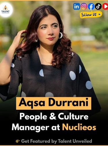 I’m delighted to spotlight the inspiring professional journey of Aqsa Durrani, a distinguished People & Culture Manager at Nuclieos and a forward-thinking HR leader transforming workplaces across the IT industry. With over 13 years of diverse experience including 4+ years in Human Resources, Technical Recruitment, and People Excellence Aqsa brings unmatched expertise, strategic insight, and a passion for people development to every organization she serves.
